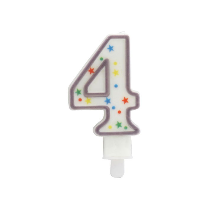 - Vela numeral con la cifra 4, decorada con círculos y estrellas, con ribete de color.