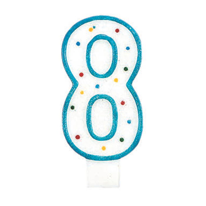- Vela numeral con la cifra 8, decorada con círculos y con ribete de color.