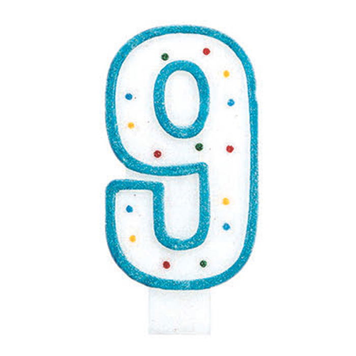 - Vela numeral con la cifra 9, decorada con círculos y con ribete de color.