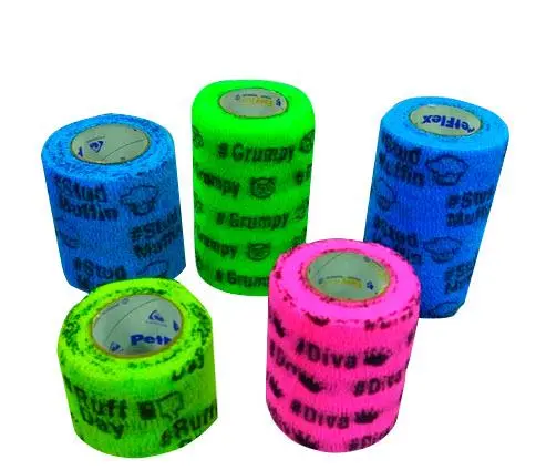 La venda Petflex Emoji de Andover es una venda adhesiva elástica disponible en un tamaño práctico de 10 cm de ancho por 4.5 metros de largo por unidad.