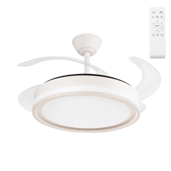 Ventilador DC realizado en metal, ABS y policarbonato en color blanco con cuatro aspas desplegables transparente muy resistentes. Tiene seis velocidades ajustables. Tecnología LED integrada con una potencia de 59W, con 3 TEMPERATURAS SELECCIONABLES DE LUZ (3500-4000-6500K) y 5900 lúmenes. Control de aire verano o invierno. Su medida es de 35,5/45,5X48 centímetros con las aspas plegadas y de 35,5/45,5X107 centímetros con las aspas desplegadas. Incluye dos tijas de 10 y 20 centímetros, para colocar a distintas alturas. Mando a distancia INCLUIDO y TEMPORIZADOR 1/2/4 H. Otras características: Número de aspas: 4 Aspas Número de velocidades ajustables: 6 Velocidades Control de aire para verano o invierno:Verano e Invierno Medida del diámetro (cm.): 107 cm. Tipo de motor: Motor DC Temporizador ventilador: 1H < 4H Material Motor: Metal / Policarbonato Material Aspas: ABS Color Motor: Blanco Color Aspas: Transparente Incluye Tija de dos medidas: 10 cm y 20 cm Velocidad Potencia Rpm Flujo Aire Nivel sonido 1 6 W 150 rpm 2650 m3 20 dB 2 10 W 169 rpm 3744 m3 23 dB 3 14 W 200 rpm 4600 m3 25 dB 4 19 W 210 rpm 5990 m3 27 dB 5 25 W 225 rpm 7180 m3 30 dB 6 30 W 240 rpm 8953 m3 33 dB