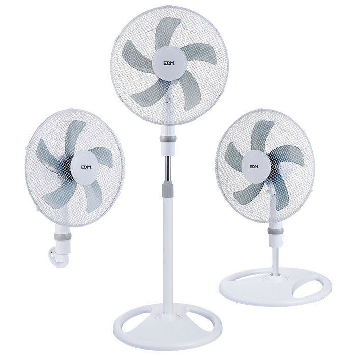 Ventilador 3 en 1, 45 w, aspas ø40 cm. 3 posiciones: de pie, de pared y sobremesa. 3 velocidades de ventilación, rejilla de seguridad, cabezal orientable, de posición fija u oscilante. altura regulable. pies antideslizantes. flujo de aire máximo: 3.000 m³/h. dimensiones: base 43 cm, cabezal: 45 x 45 cm, altura regulable 107 a 133 cm. 220 - 240 v ~ 50 hz