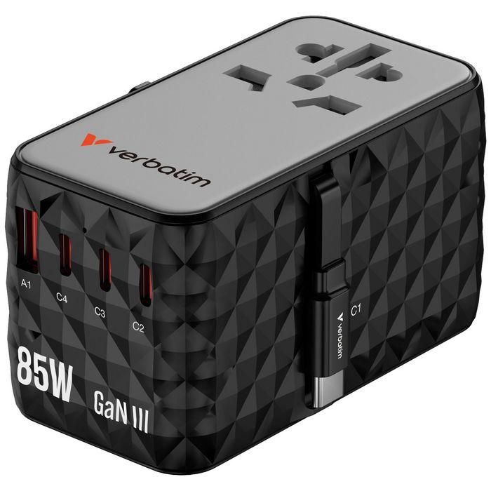The compact and powerful Verbatim Charge 'n' Travel GaN III Universal Travel Adapter allows six devices to be charged simultaneously through the AC power socket, three USB-C ports, USB-A port and retractable USB-C cable, offering a total output of 85W. Enough to charge phones, tablets and other devices effortlessly.