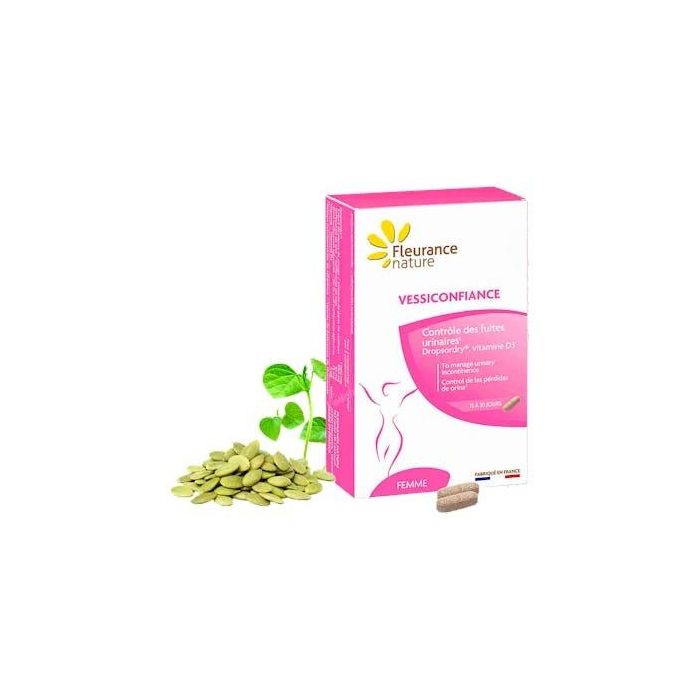 Indicaciones: VESSICONFIANCE ha sido formulado para ayudar a controlar las fugas urinarias en las mujeres. Este complejo de activos 100% de origen natural asocia Dropsordry a la vitamina D3. Dropsordry® es un activo único objetivado, que ha sido objeto de numerosos estudios científicos, mezclando isoflavonas de soja y un extracto de semilla de calabaza desarrollado para reducir de manera específica la incontinencia urinaria en las mujeres. La vitamina D3, de origen natural, refuerza las funciones del producto ya que contribuye al mantenimiento de una función muscular normal. Un complejo de activos 100% de origen natural: Dropsordry® es un activo objetivado que ha sido objeto de numerosos estudios científicos. Este producto no ha sido probado en animales, de acuerdo con la normativa europea.