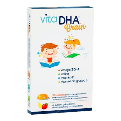 Indicaciones: Complemento alimenticio de omega-3 DHA y EPA, colina y vitaminas, en suaves pastillas masticables con sabor a limón y maracuyá. Proporciona los nutrientes necesarios para el desarrollo del cerebro de los niños en edad escolar: el DHA contribuye al mantenimiento de la función normal del cerebro y la visión. Apto a partir de 3 años.