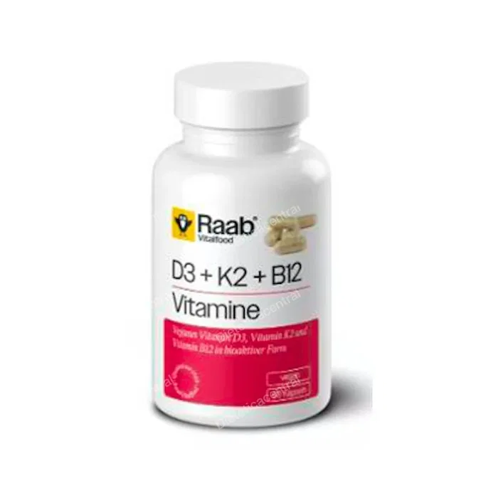 Indicaciones: Las cápsulas Raab Vitamin D3+K2+B12 contienen vitamina D3 vegana ( colecalciferol ), vitamina K2 vegana ( menaquinona-7 ) en la forma bioactiva totalmente trans y vitamina B12 vegana ( metilcobalamina ) en la forma bioactiva. La vitamina D contribuye al mantenimiento de la función muscular normal y al funcionamiento normal del sistema inmunológico. La vitamina K ayuda al mantenimiento de los huesos en condiciones normales. La vitamina B12 contribuye a reducir el cansancio y la fatiga. Producto vegano, sin gluten ni lactosa.