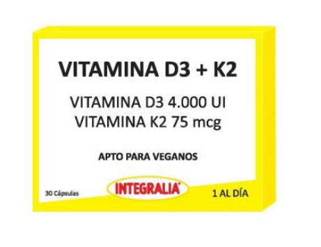 VITAMINA D3 COLECALCIFEROL (EXTRACTO DE LIQUEN (Cladonia rangiferina L.,) RICO EN VITAMINA D3) 100 microgramos 4.000 UI (2.000% V.R.N.) por cápsula. VITAMINA K2 MENAQUINONA (FERMENTACIÓN NATURAL) 75 microgramos (100% V.R.N.) por cápsula