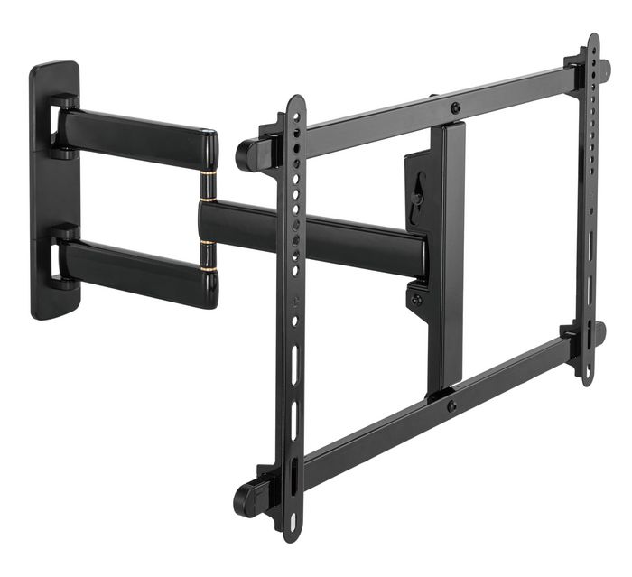 Soporte de pared para pantallas de tamaño medio con movimiento completo, construido en aluminio de diseño negro sólido. Con funciones de inclinación y giro. Instalaciones típicas: Salas de reuniones, restaurantes, oficinas, hoteles o salas de estar.