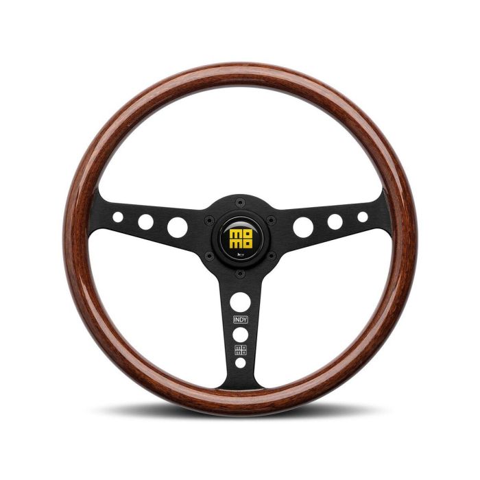 El volante MOMO Indy tiene un bello acabado de madera de caoba acentuada por sus rayos cortados de aluminio cepillado. Su apariencia antigua evoca a los volantes clásicos de madera de años anteriores y refleja la herencia de 50 años de MOMO, la cual comenzó en 1964. El diámetro del MOMO Indy es de 350mm, con hendiduras para los dedos en la parte trasera de la rueda. El volante Indy incluye el logo Heritage Prototipo en el botón de bocina.