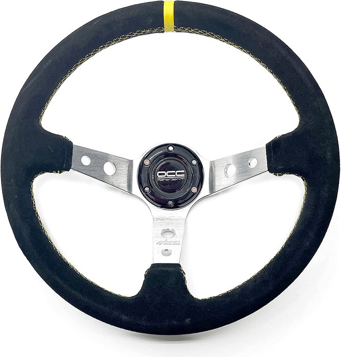 El volante racing OCCVOL001 de la marca OCC Motorsport es un volante de competición universal diseñado para ofrecer una combinación equilibrada entre funcionalidad y estilo en vehículos tanto de simulación como reales, especialmente en aquellos sin airbag. Fabricado en China, este volante cuenta con una estructura robusta de aluminio plateado de gran calidad y acabado en piel vuelta negra, que proporciona una sensación suave y cómoda al tacto, junto con un agarre antideslizante que mejora el control y la seguridad durante la conducción intensa. Sus dimensiones destacan con un diámetro de 350 mm, un grosor de 32 mm para un manejo preciso y una profundidad de 90 mm, configurándose como un volante desplazado con montaje mediante 6 tornillos para facilitar una instalación firme y segura en la mayoría de modelos de coche mediante conos compatibles de marcas como Sparco u OMP. Su diseño incorpora detalles en color negro con ribetes y costuras amarillas que aportan un aspecto deportivo y atractivo, complementado con tres radios de aluminio plateado que no solo aumentan su resistencia sino que también realzan la estética del volante. Su instalación es relativamente sencilla aunque se recomienda realizarla de forma profesional, y es importante destacar que para homologarlo en vehículos de calle es necesario que el coche no cuente con airbag en el volante, requiriendo en este caso un proyecto y reforma de laboratorio para su inclusión en ficha técnica. Además de su uso en vehículos reales, este volante es especialmente popular en el ámbito de los simuladores de carreras, brindando una experiencia realista y de alta fidelidad para los usuarios de simulación. En definitiva, el volante deportivo OCCVOL001 de OCC Motorsport combina materiales de calidad, diseño ergonómico y compatibilidad universal para proporcionar una solución funcional y estética en volantes de competición y simulación.