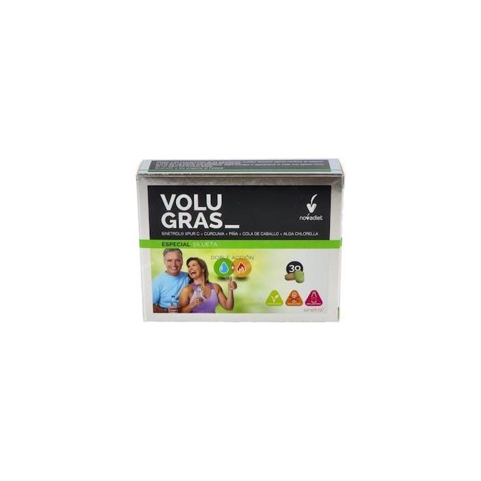 Indicaciones: Volugras es un suplemento alimenticio de ayuda en el control del peso en el marco de un estilo de vida saludable, gracias a que su composición incluye Sinetrol® Xpur C, un ingrediente de marca registrada formado por una combinación de extractos de pomelo, naranja dulce y guaraná y un concentrado de naranja sanguina. Sus principios activos más importantes son polifenoles procedentes de los cítricos y cafeína procedente del guaraná, que cuentan con estudios clínicos que avalan su mecanismo de acción y sus beneficios en la composición corporal, en relación a la reducción de masa grasa sin pérdida de masa muscular. También aporta otros ingredientes como Cola de caballo, una planta con actividad diurética y remineralizante. Apto para veganos.