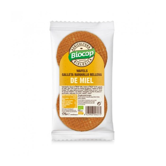 Composicion: Sirope de TRIGO* 28%, harina de TRIGO* 21.5%, azúcar de caña*,miel* 12%, aceite de semillas de girasol*, harina de TRIGO integral* 8%, agua, manteca de cacao*, HUEVO entero en polvo*, sirope de azúcar invertido*, sal marina, emulgente: lecitina de girasol*, gasificante: carbonato de sodio, canela*, limón*. Valor nutricional por 100 g: Valor energético:1814kJ/434 kcal Fibra alimentaria:1,8 g Proteínas:3,7 g Sal:0.45 g Grasas:15.9 g Hidratos de carbono:67,7 g *De agricultura biológica. +Contiene Gluten, Huevos y prod.a base de huevos. Puede contener Trazas de Frutos secos con cáscara, Leche y derivados, Sésamo y prod. a base de sésamo, Soja y derivados.