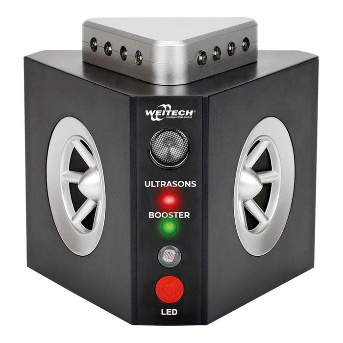 Repelente ultrasónico 3 en 1 para roedores. cobertura hasta 300 m² en interiores. incluye 2 altavoces de 240°, amplificador de frecuencia y sistema flash 360° con 12 leds y sensor de luminosidad. tensión: 220 - 240 v ~50/60 hz. dimensiones: 11 x 9,5 x 9,5 cm