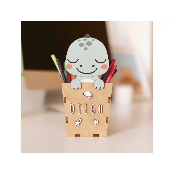 Wondee Cubilete Portalápices Personalizable Dino Madera para Escritorio Infantil 180x80x100 mm