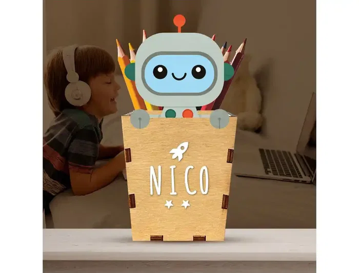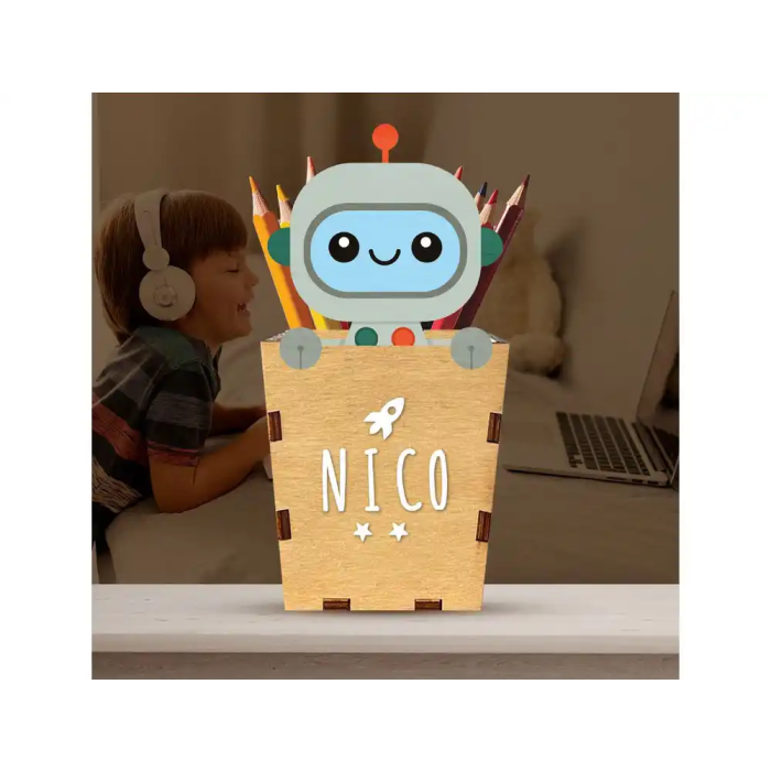 Wondee Portalápices Personalizable de Madera Robot, Cubilete Infantil para Lápices y Útiles Escolares, 10x19 cm, Materiales Sostenibles