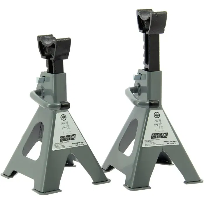 Paire de chandelles a crémaillere d'une capacité de 3000 kg et d'une hauteur de levage de 285 a 420 mm. Elles offrent une grande stabilité grâce a leurs 4 pieds larges et leur systeme a crémaillere autobloquant avec goupilles de sécurité. Cet outillage est indispensable pour intervenir en toute sécurité sur les parties basses de votre véhicule et/ou lors de l'utilisation d'un cric.