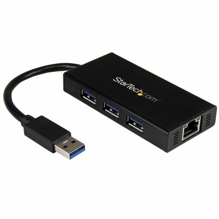 L’adaptateur réseau ST3300GU3B de Startech est un concentrateur portable conçu pour étendre et améliorer la connectivité des ordinateurs portables ou Ultrabooks via un seul port USB 3.2 Gen 1. Ce dispositif combine la fonction de concentrateur avec trois ports USB 3.2 Gen 1 externes, compatibles avec la technologie UASP pour optimiser le transfert de données, et un port Gigabit Ethernet intégré (RJ45), offrant une connexion filaire jusqu’à 1 Gbps selon les normes IEEE 802.3/u/ab, idéal pour des environnements nécessitant stabilité et rapidité constantes. Fabriqué avec un boîtier en aluminium noir léger et résistant, il comprend des voyants LED facilitant la surveillance de l’état de la connexion et fonctionne avec une interface hôte USB 3.0/3.2, compatible USB 3.0 et 3.2, garantissant performance optimale et polyvalence. Son design compact et son câble intégré le rendent particulièrement pratique pour le transport et l’usage en mobilité, évitant les câbles supplémentaires. De plus, le port Ethernet prend en charge la fonction Wake-on-LAN (WOL), permettant le redémarrage à distance via le réseau, une fonction utile pour l’administration et la maintenance à distance. Il est particulièrement adapté pour connecter des périphériques à faible consommation, comme claviers, souris ou clés USB, ainsi que des appareils externes nécessitant une alimentation via l’adaptateur fourni, tels que des boîtiers de disques durs. Ce concentrateur, avec une connectivité filaire et un débit maximal de transfert jusqu’à 5000 Mbit/s, est compatible avec des appareils tels que Microsoft Surface™ Pro 3 et Pro 4, Surface Book, Dell™ XPS 13, entre autres, ouvrant de nouvelles possibilités pour les portables souvent limités en ports et options de connexion. En résumé, le Startech ST3300GU3B est un accessoire compact et robuste intégrant efficacement des ports USB et un réseau Ethernet haute vitesse pour améliorer la connectivité professionnelle et personnelle des appareils mobiles.