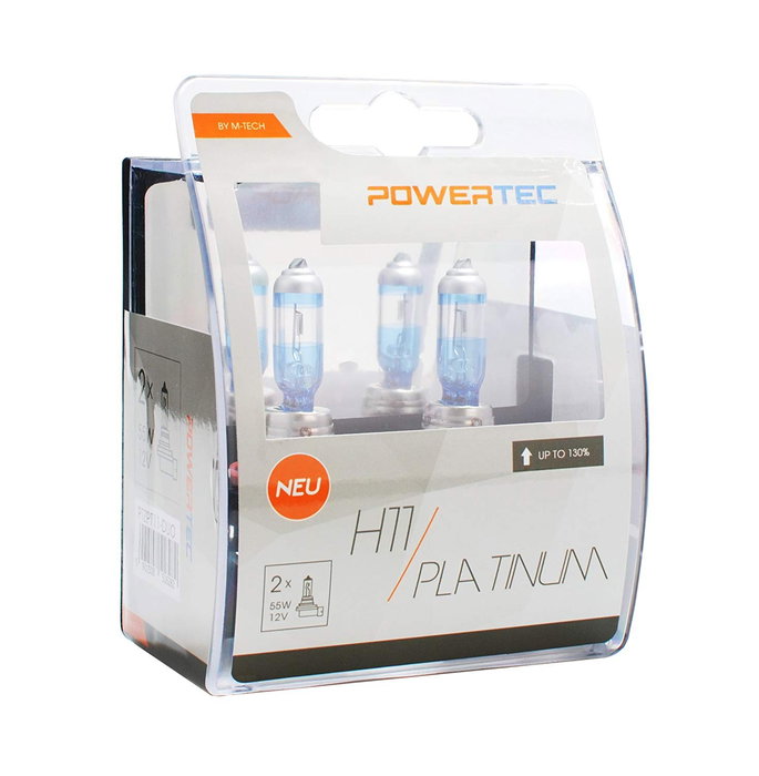 Ampoule halogène PowerTec 12V 55W H11 PLATINUM +130% La série PLATINUM offre jusqu'à 130% de lumière en plus sur la route par rapport aux ampoules halogènes standard. La construction de l'ampoule avec un filtre spécial suivant les normes des produits phares assure une lumière forte, de longue portée et de couleur blanc neige. Les ampoules PLATINUM se distinguent par la même couleur de lumière spécifiée en Kelvin et le flux lumineux mesuré en lumens, moins puissant de seulement 5% par rapport aux marques de premier plan. L'utilisation des ampoules de la série PLATINUM permet d'obtenir un effet de lumière blanche parfaite, qui est moins fatigante pour la vue du conducteur et reflète mieux les indications et signaux de la route. Le faisceau lumineux allongé aide à détecter les obstacles plus tôt, garantissant ainsi une plus grande sécurité et visibilité. Les ampoules PowerTec se caractérisent par une durabilité accrue grâce à la fabrication en verre de quartz trempé et en acier de haute qualité. La durée de vie moyenne de l'ampoule est de 350 heures de travail. DESCRIPTION : - Jusqu'à 130% de lumière en plus - Distance focale excellente ajustée - Construction de filament solide - Mélange de gaz noble - Protection UV - Fabriquée en verre de quartz - Base en acier trempé - Emballage DUO élégant SPECIFICATIONS : Type : H11 Douille : PGJ19-2 Puissance : 55W Tension : 12V Homologation : E4