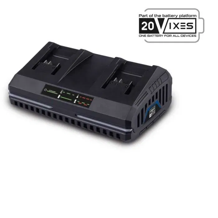 Le chargeur double SDBC2.4A de la marque SCHEPPACH permet de charger simultanément deux batteries Li-ion de la gamme Scheppach 20V IXES. Il fonctionne sur secteur.