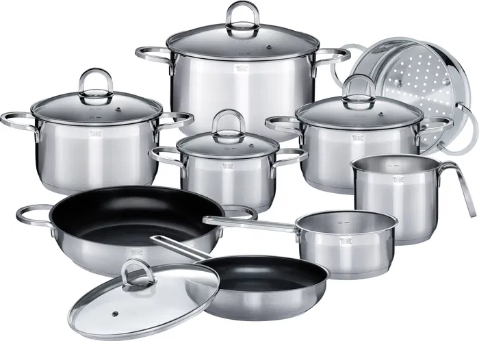 GSW Batterie de cuisine induction Alara en acier inoxydable 18/10, 14 pièces, couvercle verre trempé, poignées ergonomiques