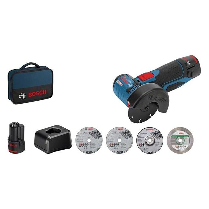 Bosch GWS 12V-76 Professional - Meuleuse d'angle sans fil 12V, diamètre 76 mm, 19500 tr/min, 2 Ah, avec batterie et chargeur - Noir/bleu/rouge