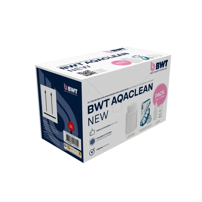 - Description du produit: AQACLEAN AND PROTECT NEW est une solution complète d’entretien pour adoucisseurs domestiques, combinant nettoyage profond et protection durable des résines. Le pack contient deux produits complémentaires : une boîte de pastilles IOCLEAN, efficaces contre les dépôts minéraux (calcaire, oxydes de fer) et une solution Protecteur Résines, ciblant les pollutions organiques (biofilm, corps gras). Ensemble, ils assurent une performance optimale de l’adoucisseur toute l’année : 2 pastilles tous les 6 mois, et 1 dose de protecteur par an ou après un arrêt prolongé. Ces pastilles solides remplacent avantageusement l’ancien STERICLEAN en réduisant les déchets plastiques. Adapté à tous les modèles d’adoucisseurs BWT, ce pack garantit une eau adoucie de qualité, des résines propres et une durée de vie d’appareil prolongée.