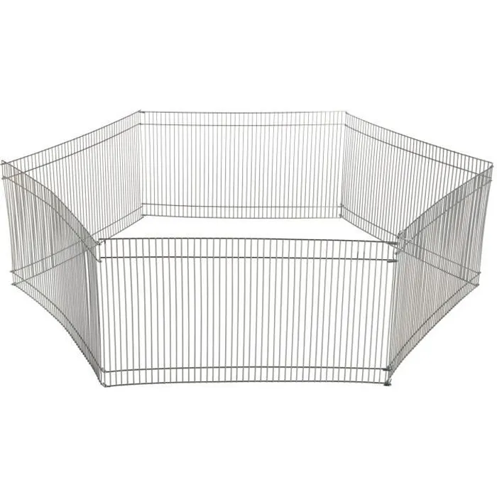 Enclos en métal galvanisé pour usage intérieur. Composé de 6 éléments de 48x25cm, il offre un grand espace de liberté a l'animal. Extensible avec d'autres enclos. Dimensions : Ø90x25cm. Convient aux petits animaux.