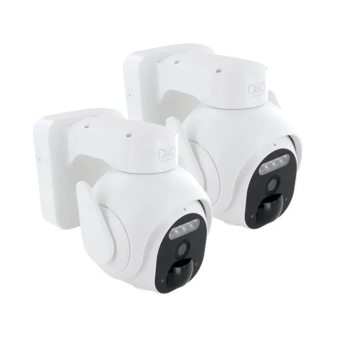 Dio Connected Home - Caméra de sécurité extérieure WiFi 3MP avec vue 350° - Lot de 2 caméras rotatives à batterie longue durée et vision nocturne