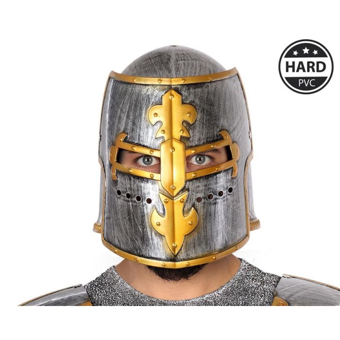 Casque Medieval en PVC Rigide Adulte, Finition Metallique Argentee avec Ornements Dores - Ideal pour Costume de Chevalier Templier, Croise ou Guerrier Medieval