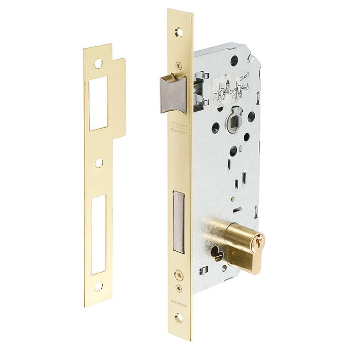 Tesa 2030/50/HL - Serrure à larder pour porte en bois, entrée 50mm, distance entre axes 85mm, réversible, finition dorée, cylindre Europerfil TE5 avec 3 clés