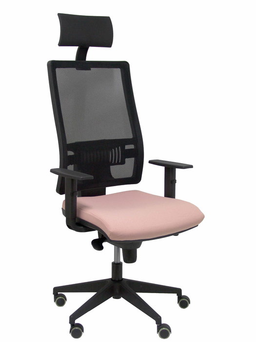 Silla de oficina Horna con mecanismo Sincro tapizada con Tela color Rosa pálido y malla color Negro. Equipada con lumbar 1D, Brazos 1D, Cabecero Fijo y Ruedas de parqué