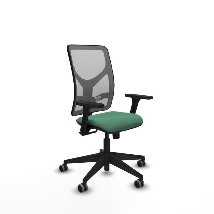 Chaise Motilla Synchro 3 positions tissu Vert émeraude Maille Gris Base pyramidale noire Accoudoir 3D Sans appui-tête Roulettes 65mm pour moquette