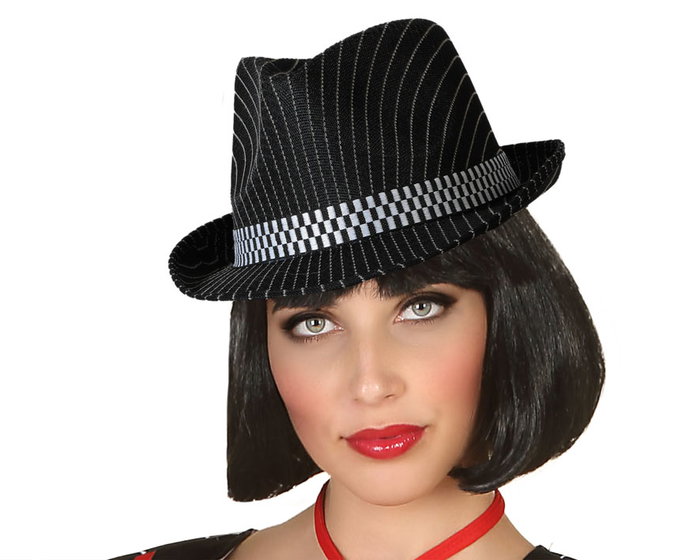 Distinguez-vous avec un look puissant et élégant grâce à ce chapeau de gangster noir à rayures blanches. Conçu pour femme, sa bande à motif damier lui apporte une touche de force visuelle idéale pour des déguisements de mafieuse, des personnages de cabaret ou des fêtes à thème des années 20.