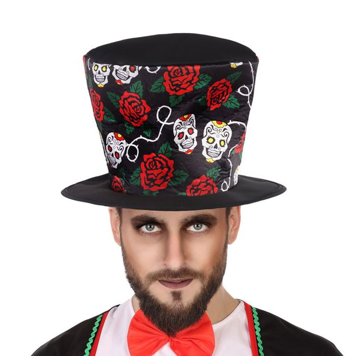 Sombrero de Copa Noir Décoré avec Roses et Crânes pour Homme Adulte - Accessoire Fête du Jour des Morts et Costume Catrín