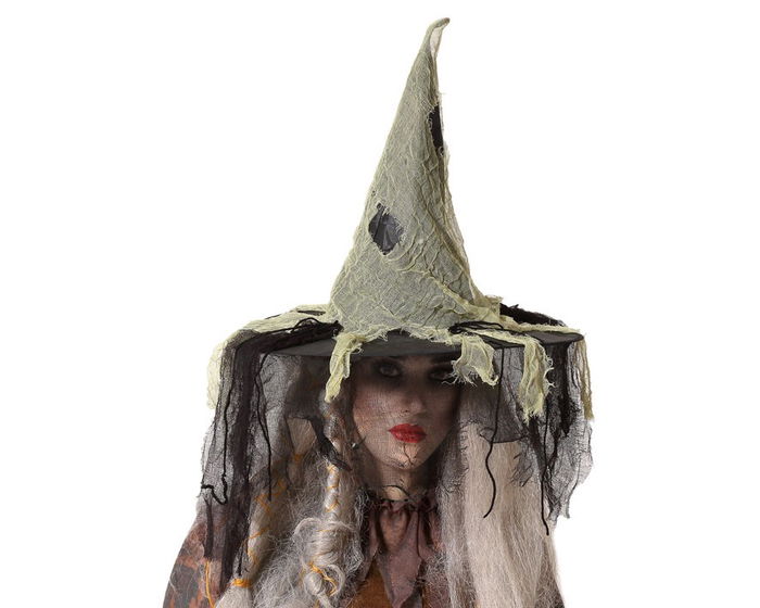 Sombrero de sorcière marécageuse, vert, aspect vieilli avec haillons et filet noir - Déguisement Halloween et théâtre