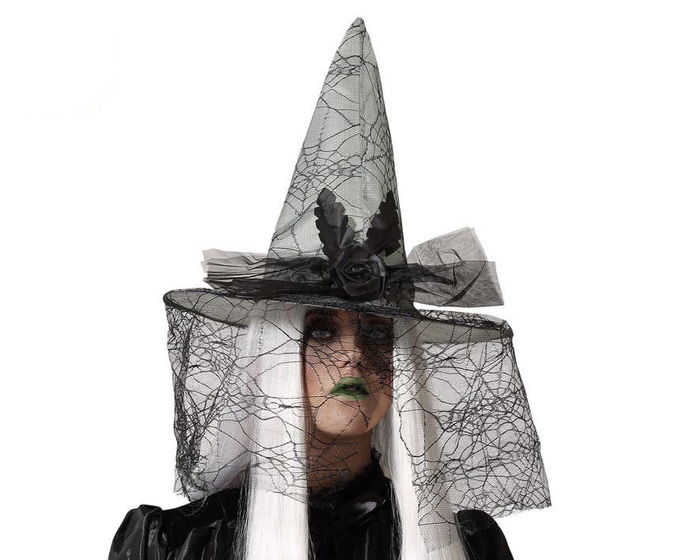 Chapeau de Sorcière Gris avec Voile Toile d'Araignée et Rose Foncée - Accessoire Costume Halloween