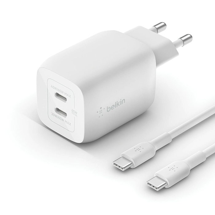 Le chargeur mural Belkin modèle WCH013VF2MWH-B6 offre une solution de charge avancée et polyvalente pour les utilisateurs recherchant rapidité et efficacité en toutes circonstances. Conçu en plastique résistant blanc, ce chargeur intègre la technologie GaN (nitrure de gallium), garantissant une charge sûre, efficace et compacte, tout en réduisant le risque de surchauffe et permettant un design ultraportable, idéal à la maison comme en voyage. Doté de deux ports USB-C et compatible avec la dernière technologie USB-C Power Delivery 3.0 (PD 3.0) et PPS (Programmable Power Supply), il est conçu pour fournir une charge rapide et adaptative selon l’appareil connecté, qu’il s’agisse d’un smartphone, d’une tablette ou même d’ordinateurs portables à forte consommation. Ce modèle délivre jusqu’à 65 W de puissance sur un seul port USB-C, suffisant pour alimenter des ordinateurs portables compatibles, ou peut répartir l’énergie entre les deux ports, offrant 45 W sur le port supérieur et 20 W sur l’inférieur lorsqu’ils sont utilisés simultanément, ce qui est idéal pour charger efficacement deux appareils à la fois. Il inclut un câble USB-C de 2 mètres et 100 W, offrant une plus grande flexibilité d’utilisation et d’adaptation à différents espaces. Le système PPS ajuste dynamiquement la tension de sortie pour fournir toujours la quantité d’énergie optimale à chaque appareil, prolongeant la durée de vie de la batterie et améliorant la sécurité de charge. Son design compact et léger permet de le transporter facilement dans une poche ou un sac, ce qui en fait le choix privilégié pour ceux qui ont besoin de charger leurs appareils en déplacement sans compromis sur la vitesse ni la sécurité. En résumé, ce chargeur Belkin se positionne comme une solution fiable, moderne et efficace pour ceux qui recherchent une compatibilité maximale et des performances optimales pour la charge de plusieurs appareils électroniques.