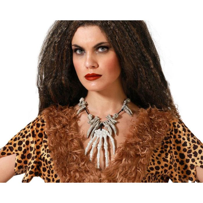 Collier avec mains squelettiques, os et canines en pierre grise pour tenue préhistorique et carnaval - Accessoire de déguisement tribal