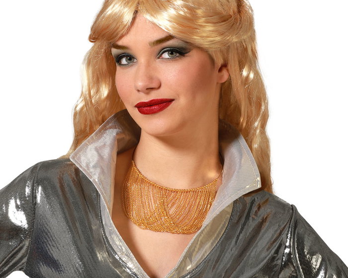 Ce collier offre une touche de sophistication avec son fini or. Sa structure en maillage apporte texture et volume, le rendant idéal pour des déguisements de diva des années 70, de chanteuse ou de personnage glamour. Il se marie particulièrement bien avec des tenues brillantes ou des robes dorées.
