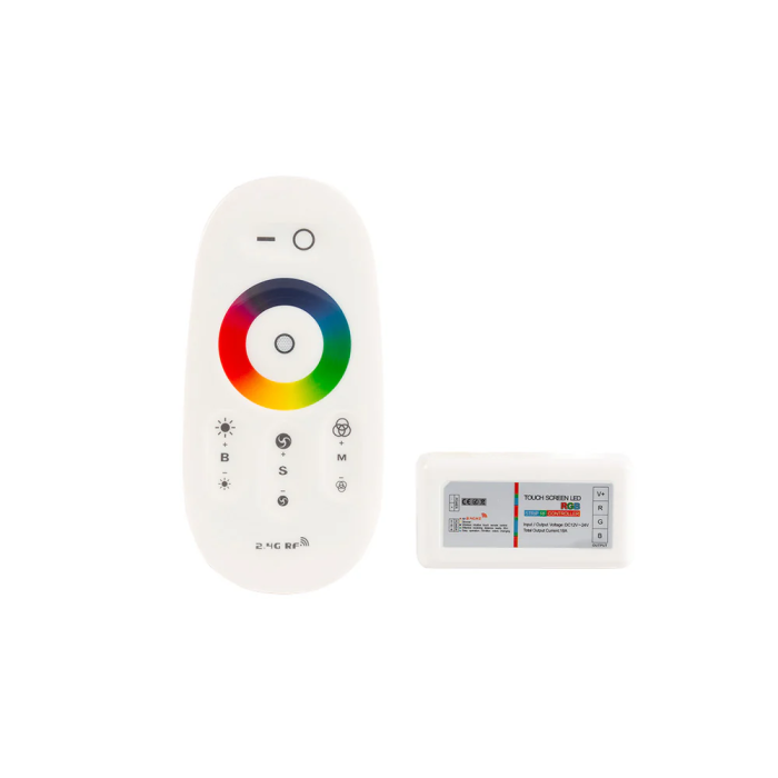 El Controlador Táctil para Tiras de LEDs RGB cuenta con un controlador RGB inteligente, con la opción de una elegante rueda táctil de color para el comando de la gama del mismo. Dotado con una tecnología inalámbrica, el control remoto de RF puede controlar la velocidad del color, el modo y el cambio con la luz tenue, además de comandos de encender, apagar y pausa en la larga distancia. Cuenta con una alta sensibilidad, gran capacidad de potencia de tracción, estable y un rendimiento fiable, este controlador de LED puede ser utilizado con todo tipo de luces Entre las características técnicas del mando controlador RGB, destacan: Rueda de color visible táctil con selección de cualquier tonalidad de color. Adaptación automática del voltaje de funcionamiento 12V-24VDC y con la función de protección de polaridad de entrada. Tecnología de control PWM con un rendimiento lumínico sin parpadeo. Control remoto mediante RF inalámbrico, libre de dirección y larga distancia, estable durante 20 metros. Bajo consumo de energía del mando a distancia y largo tiempo de espera. Funciones de memoria multi-tipo de color, modo, velocidad y brillo. Elegante apariencia, fácil instalación y alto funcionamiento de coste.