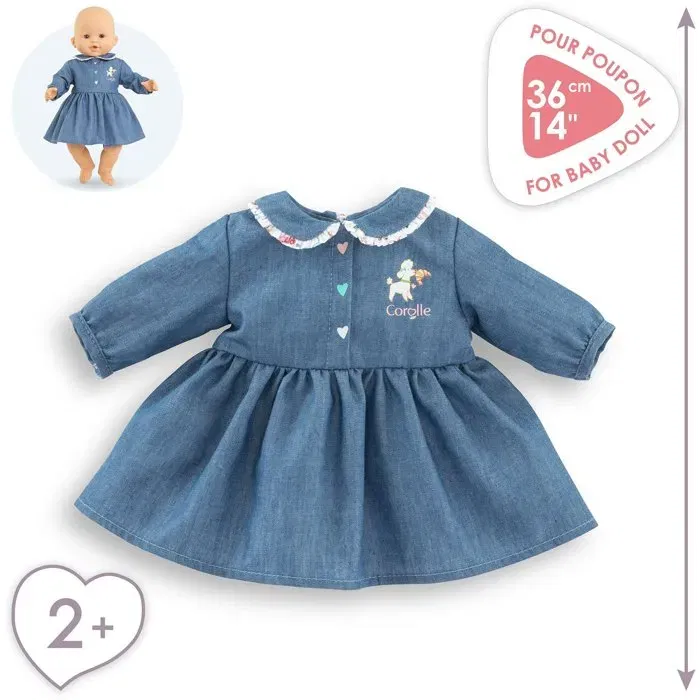 Corolle Robe poupée 36 cm imitation denim bleue avec col claudine et sérigraphie petit chien pour poupon, idéale dès 2 ans