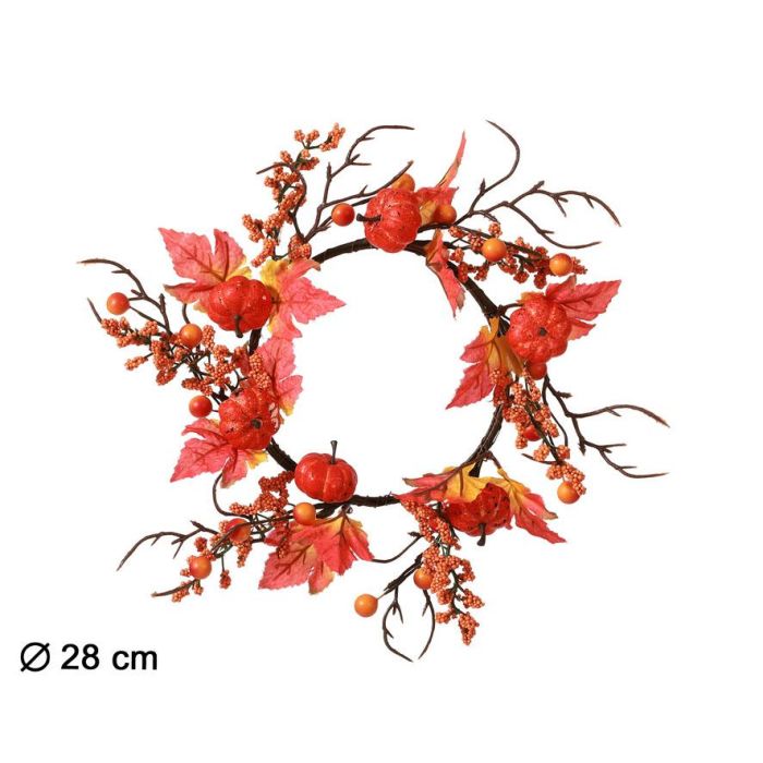 Accueillez l'automne avec cette couronne colorée de 28 cm de diamètre, décorée de feuilles aux tons rouges, de petites courges oranges et de baies. Idéale pour orner une porte, un mur ou une vitrine, cette couronne d'automne apporte une atmosphère chaleureuse et festive à votre intérieur.