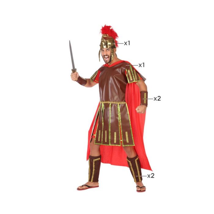 Costume Gladiateur Romain Homme Adulte Taille XS-S - Capuche Rouge, Tunique Brune, Casque, Protèges-poignets et Tibias - Polyester