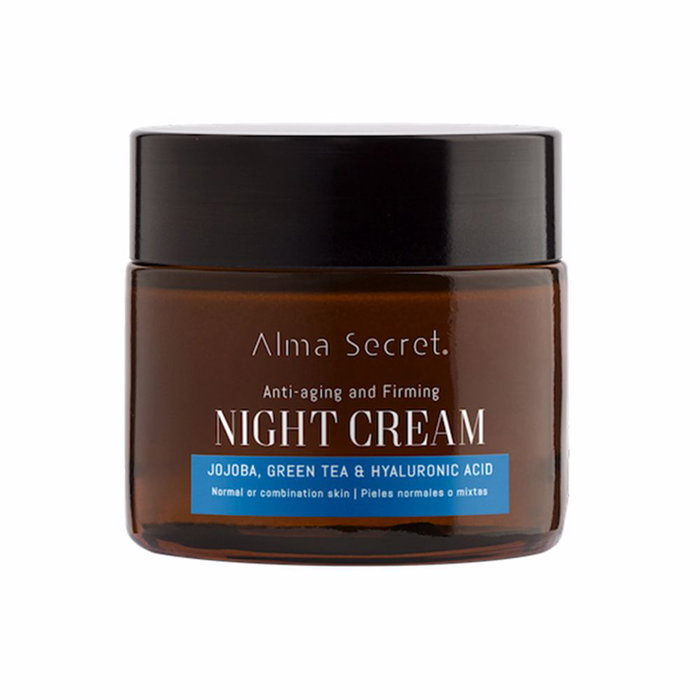 Crème de nuit Alma Secret, un traitement multi-actions riche en ingrédients naturels et en huiles biologiques pour revitaliser, éclaircir, atténuer les imperfections, améliorer la fermeté et cibler les rides d'expression. Sa formule exceptionnelle combine trois technologies végétales actives : Zizyphus Épineux, Laminaria Saccharina et Racine de Maral de Sibérie pour stimuler la régénération, optimiser l'hydratation, réduire les ridules et solidifier l'adhésion dermo-épidermique.