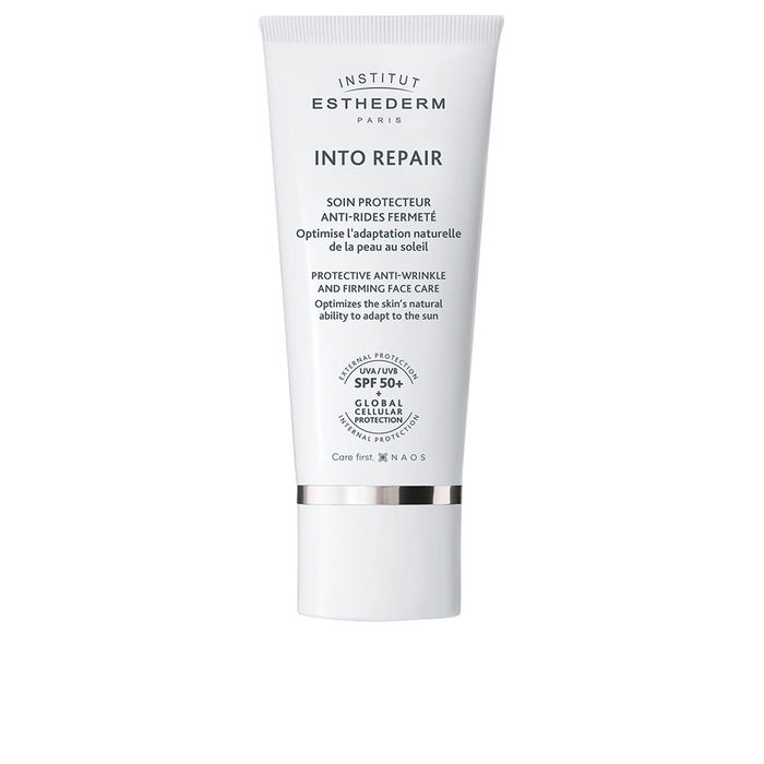 Into Repair est une crème solaire innovante de la marque Institut Esthederm. Elle combine une action anti-âge et un effet raffermissant pour une protection solaire très haute (SPF 50+).