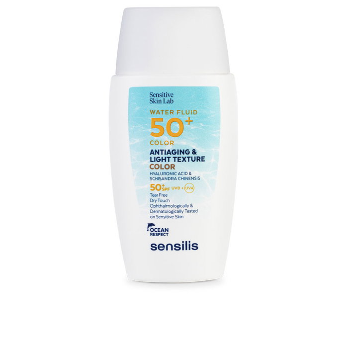 La crème anti-âge teintée Water Fluid 50+ SPF50+ de SENSILIS est un soin innovant pour le visage qui combine une très haute protection solaire et une résistance à l'eau. Sa texture légère à base d'eau fond parfaitement sur la peau pour un fini invisible, soyeux et mat, offrant une couvrance discrète, un teint uniformisé et un éclat naturel avec une sensation rafraîchissante.