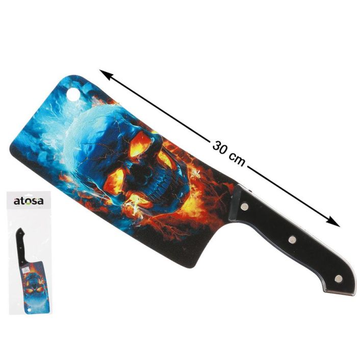 Potencia tu look más aterrador con este cuchillo con empuñadura de calavera azul. Ideal para ambientaciones oscuras, disfraces de asesino o personaje de videojuego. Ligero y sin riesgo, es perfecto para fiestas de Halloween o producciones escolares.
