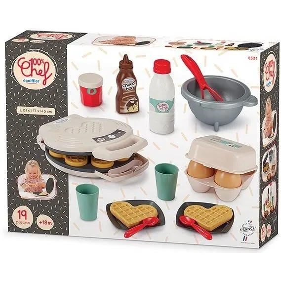 Ecoiffier Jeu d'imitation Gaufrier avec Accessoires - Dès 18 mois - Gaufres, Confiture, Chocolat, Fouet, Œufs et Lait pour Goûters Créatifs