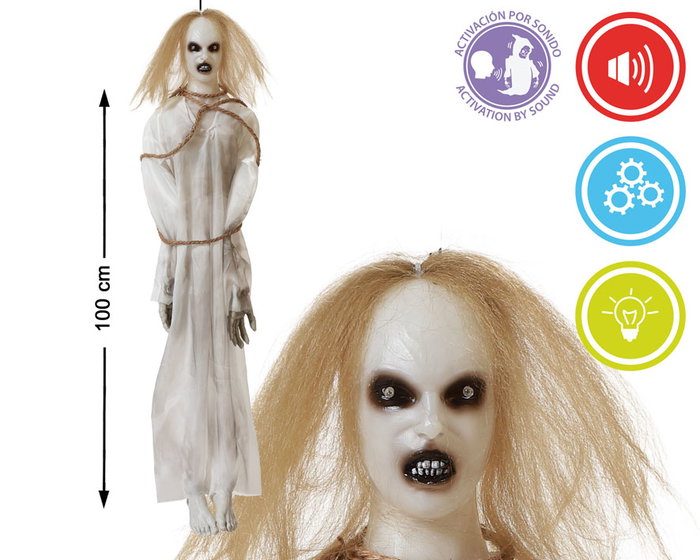 Ajoutez une touche effrayante à votre décoration avec ce fantôme suspendu de 100 cm. Il s'illumine, émet des sons terrifiants et se déplace pour renforcer l'impact visuel. Idéal pour les entrées, les arbres, les plafonds ou les intérieurs. Cet élément animé transforme n'importe quel espace en une scène d'authentique horreur.