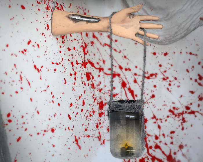 Décor Zombie - Main suspendue avec pot et lumière pour scénographie d'Halloween ou décor d'horreur